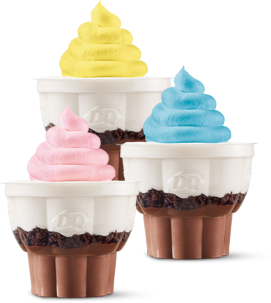 Dairy Queen cupcakes are individual-sized, frozen, dessert cups featuring layers of vanilla and chocolate soft serve, signature fudge, and chocolate crunchies, topped with frosting.